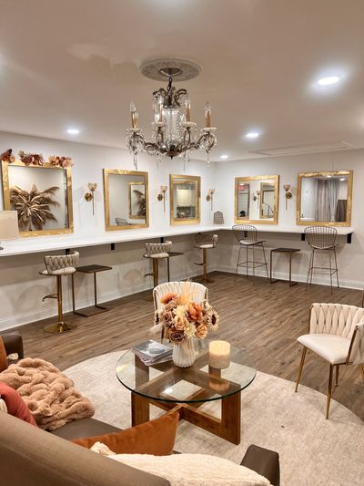 Our bridal suite can comfortably accommodate multiple guests with a spacious, large couch, a velvet accent chairs, and chairs that can be moved around.